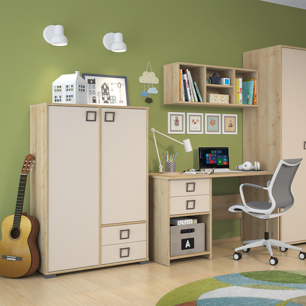 Komoda za dečiju sobu, iz kolekcije KIKI, sa dva krila i dve fioke. Raspored krila se može menjati, a zavisno od pozicije kraćeg krila, fioke se mogu montirati u uglovima pa ovaj element može imati četiri različita izgleda