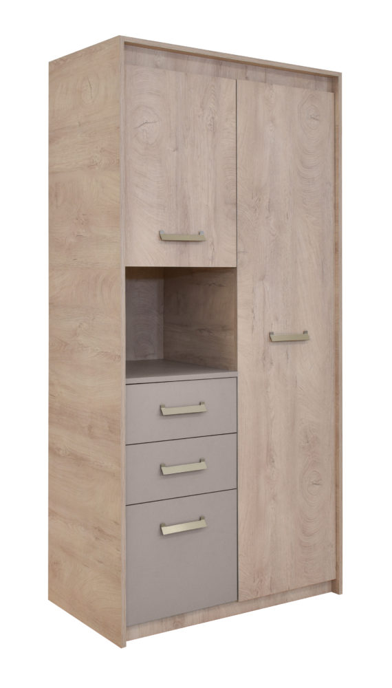 KINDER – Ormar 2V3F izrađen je od univera debljine 18mm i svojim dizajnom prilagođen je odlaganju garderobe. Dodatne fioke omogućavaju bolju iskorišćenost skladišnog prostora.