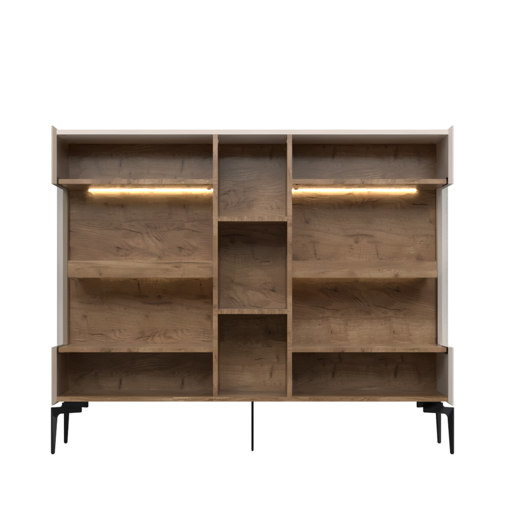-masivne police unutar elemenata sa skrivenom LED rasvetom i punim leđima u drvo-dekoru Tobacco hrast kao i parsol staklo u braon boji, daju ovoj komodi jedinstveni izgled