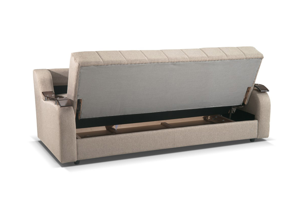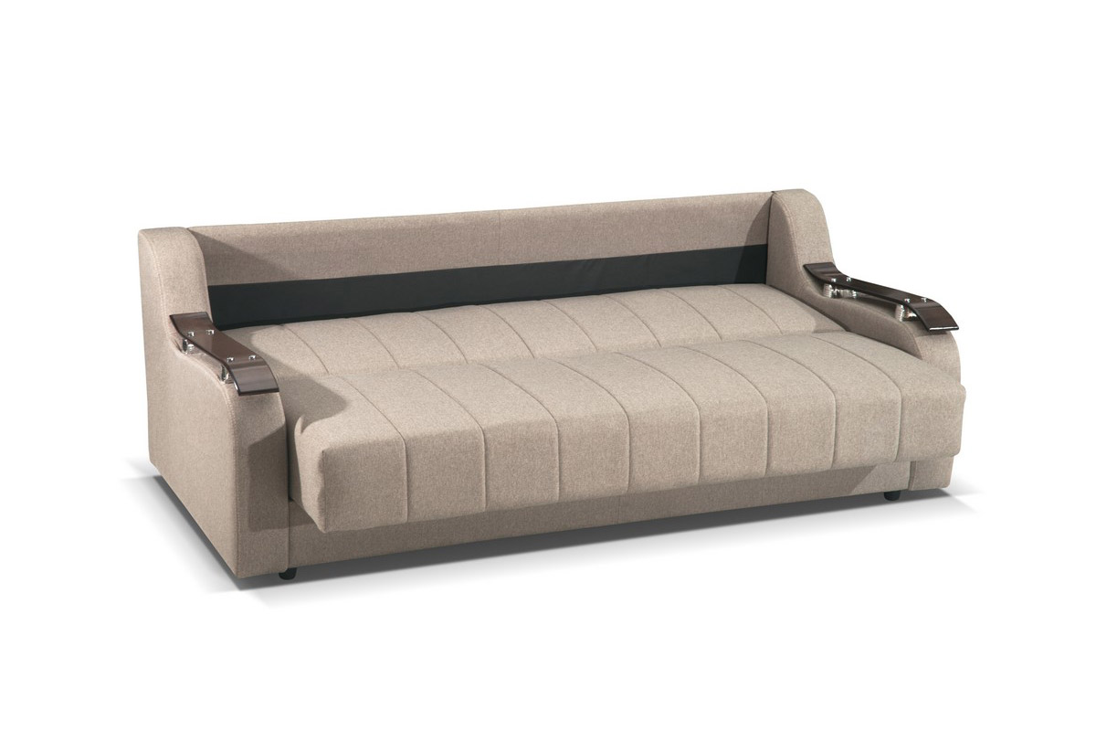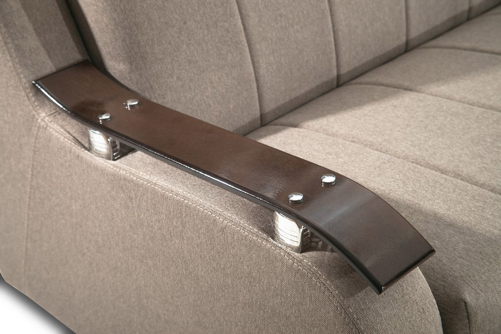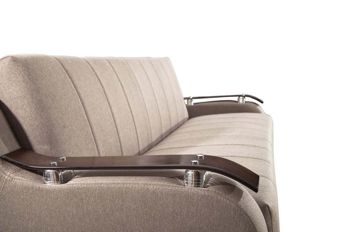 Kauč TANJA LUX predstavnik je stila koji ne izlazi iz mode. Poseduje aplikacije na rukonaslonima u boji tamnog oraha, kao i mehanizam za rasklapanje koji ga pretvara u udoban ležaj dimenzija 190x110cm za svakodnevni odmor. Poseduje funkcionalan prostor za odlaganje posteljine i žičano jezgro.