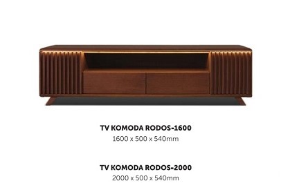 Tv komoda od drveta iz kolekcije Rodos. Izradjuje se u 12 boja.