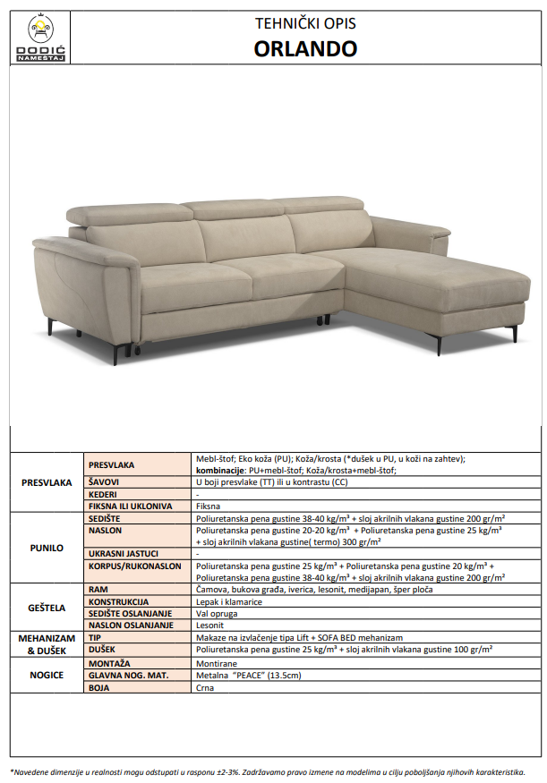 Bez obzira da li želite veliku garnituru sa puno prostora ili manju kompaktnu garnituru, modularna garnitura Orlando vam omogućava da kombinujete različite elemente kako bi odgovarale vašem prostoru. Udobnost je postignuta upotrebom inovativne pene, za naslon i glavonaslon je korišćena pena 20/20 , a za sedišta potpuno nova HR PENA 38/40. Po prvi put jedan model nudi: sofabad, lift, relax i fiksnu varijantu.