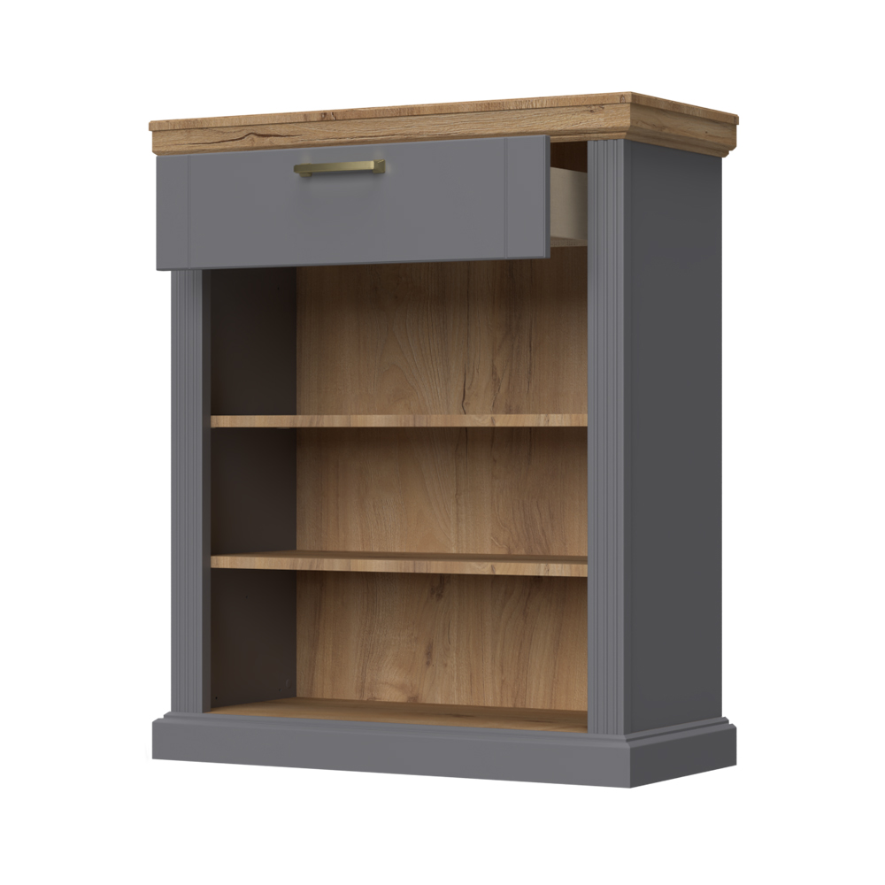 -front elementa je od rezbarenog medijapana lakiranog UV lakom sa soft mat efektom u grafit boji, a dekorativna masivna pokrivna ploča od medijapana presvučena folijom u dekoru Pacifik orah