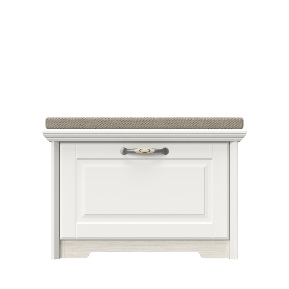 Komoda za predsoblje iz kolekcije EVERGREEN sa jednim krilom i tapaciranim jastukom za sedenje – element nameštaja za ljubitelje klasike.