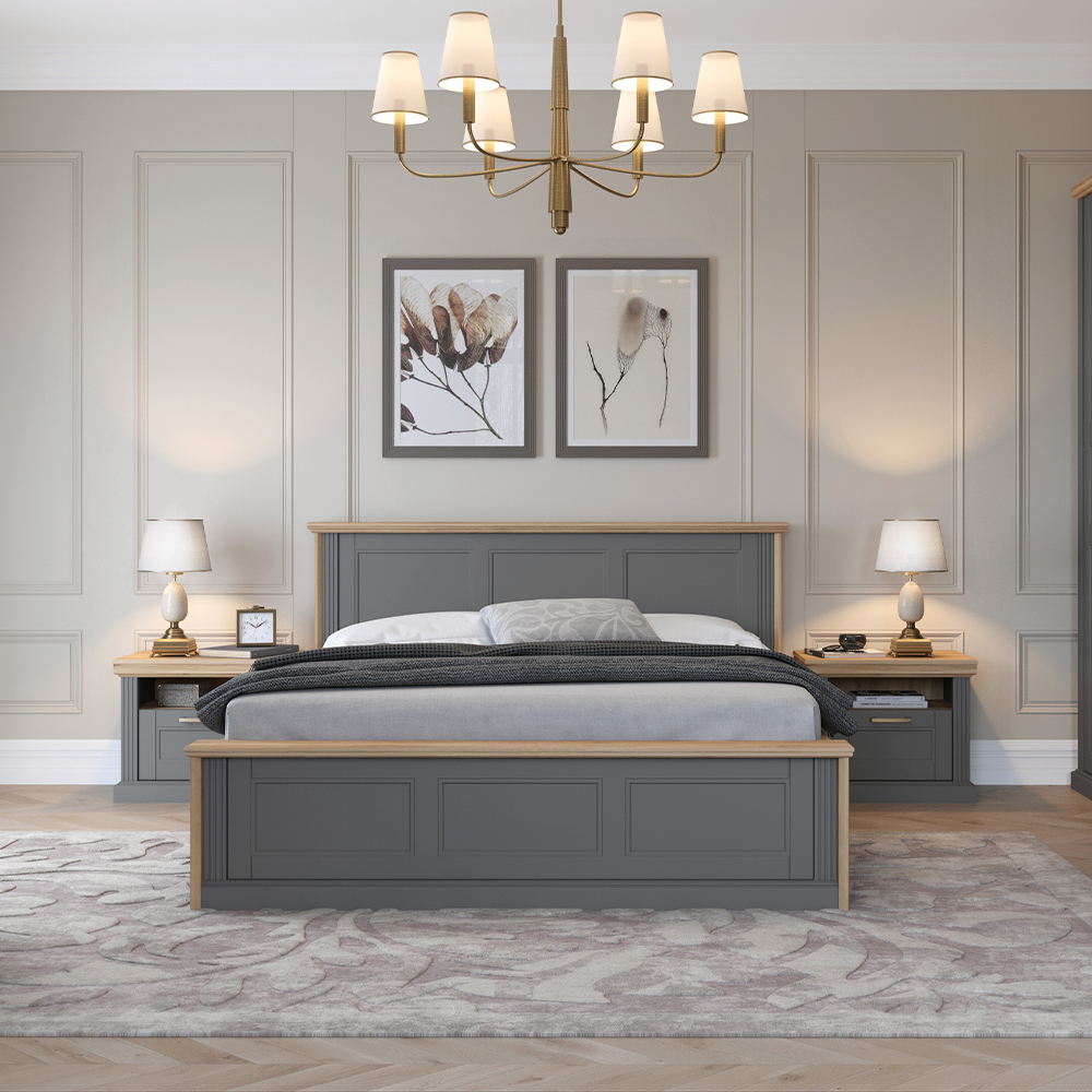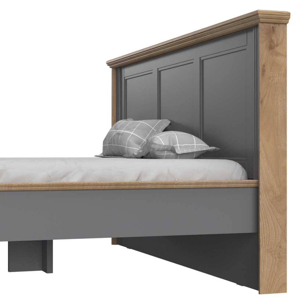• uzglavlje i uznožje su proizvedeni od rezbarenog medijapana lakiranog UV lakom sa soft mat efektom u grafit boji, a dekorativne lajsne su od medijapana presvučene folijom u dekoru Pacifik orah
