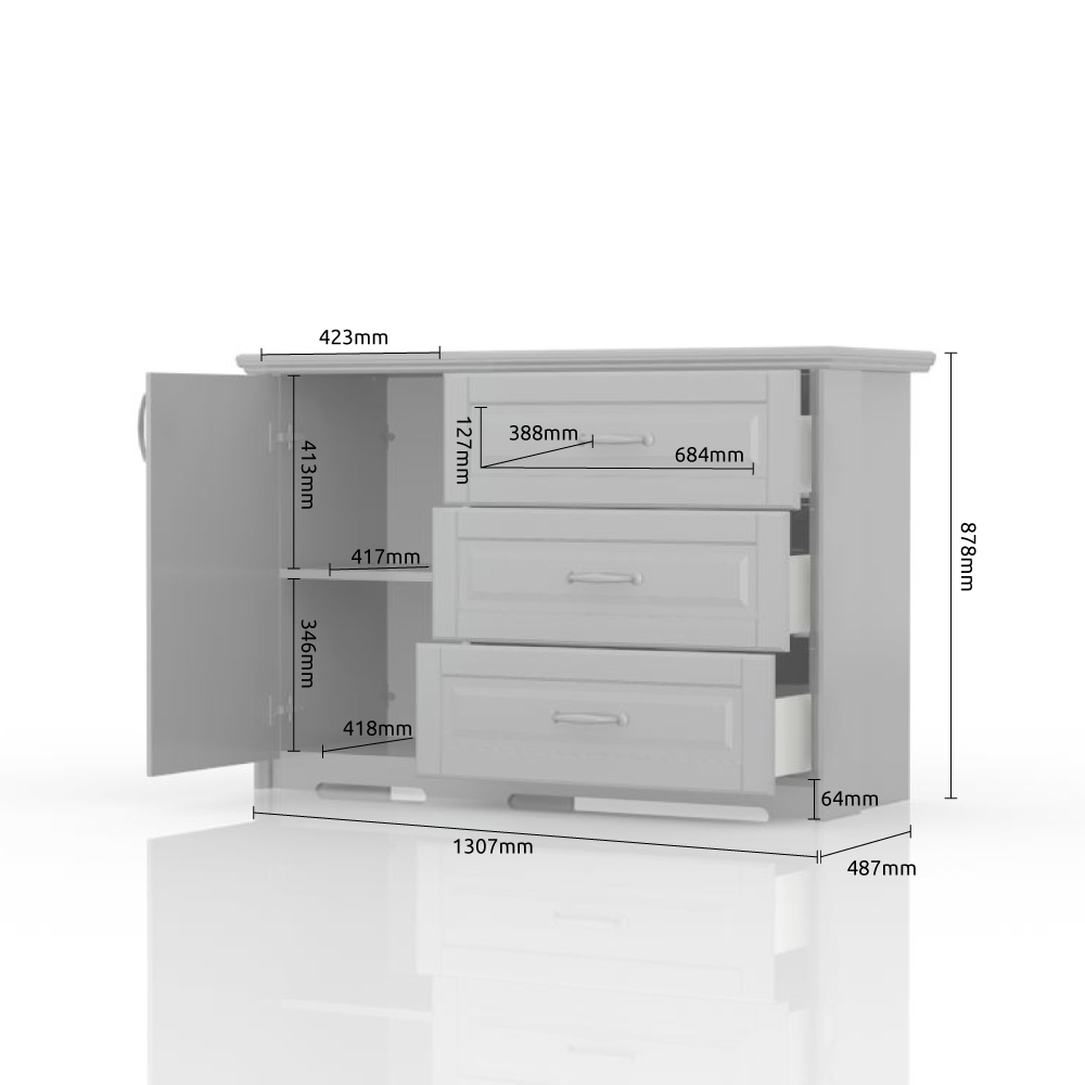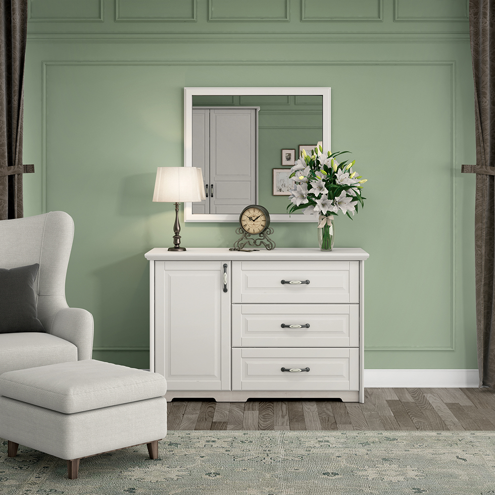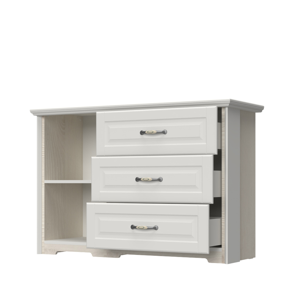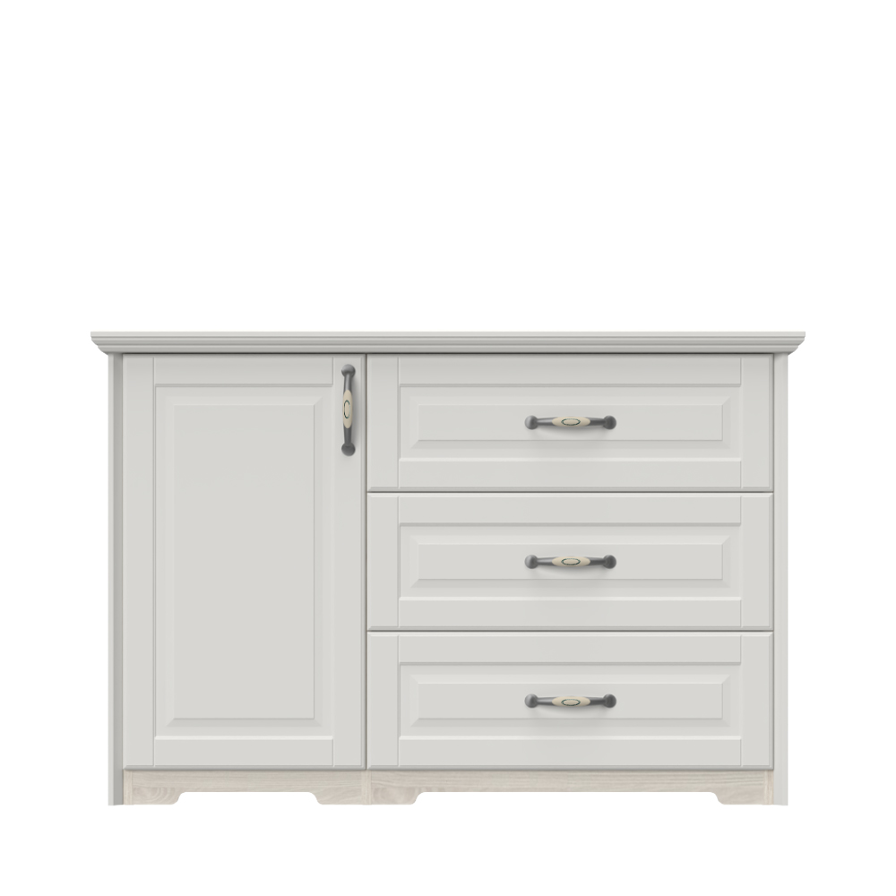 Rustična, stilizovana i funkcionalna komoda za odlaganje garderobe. Komoda za spavaću sobu ima jedno krilo koje je uvek sa leve strane elementa i tri fioke.