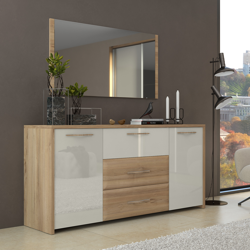 Komoda za spavaću sobu, iz kolekcije GALA, modernog dizajna sa dva krila i tri fioke.