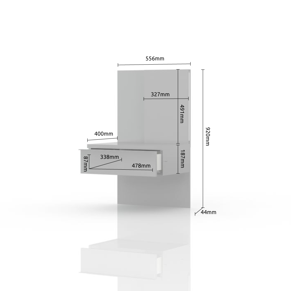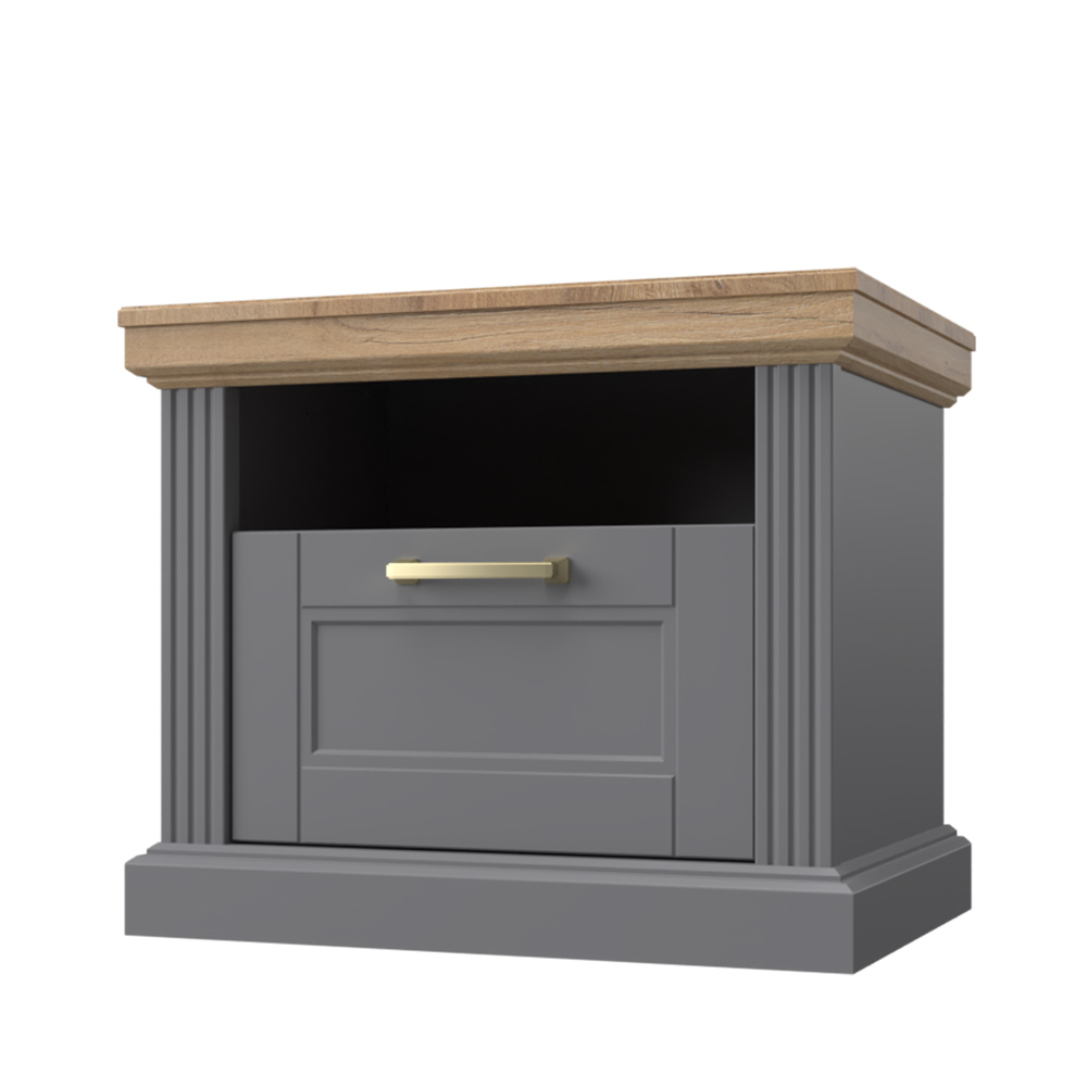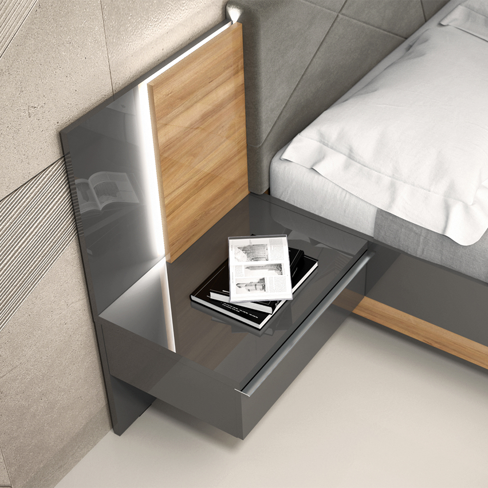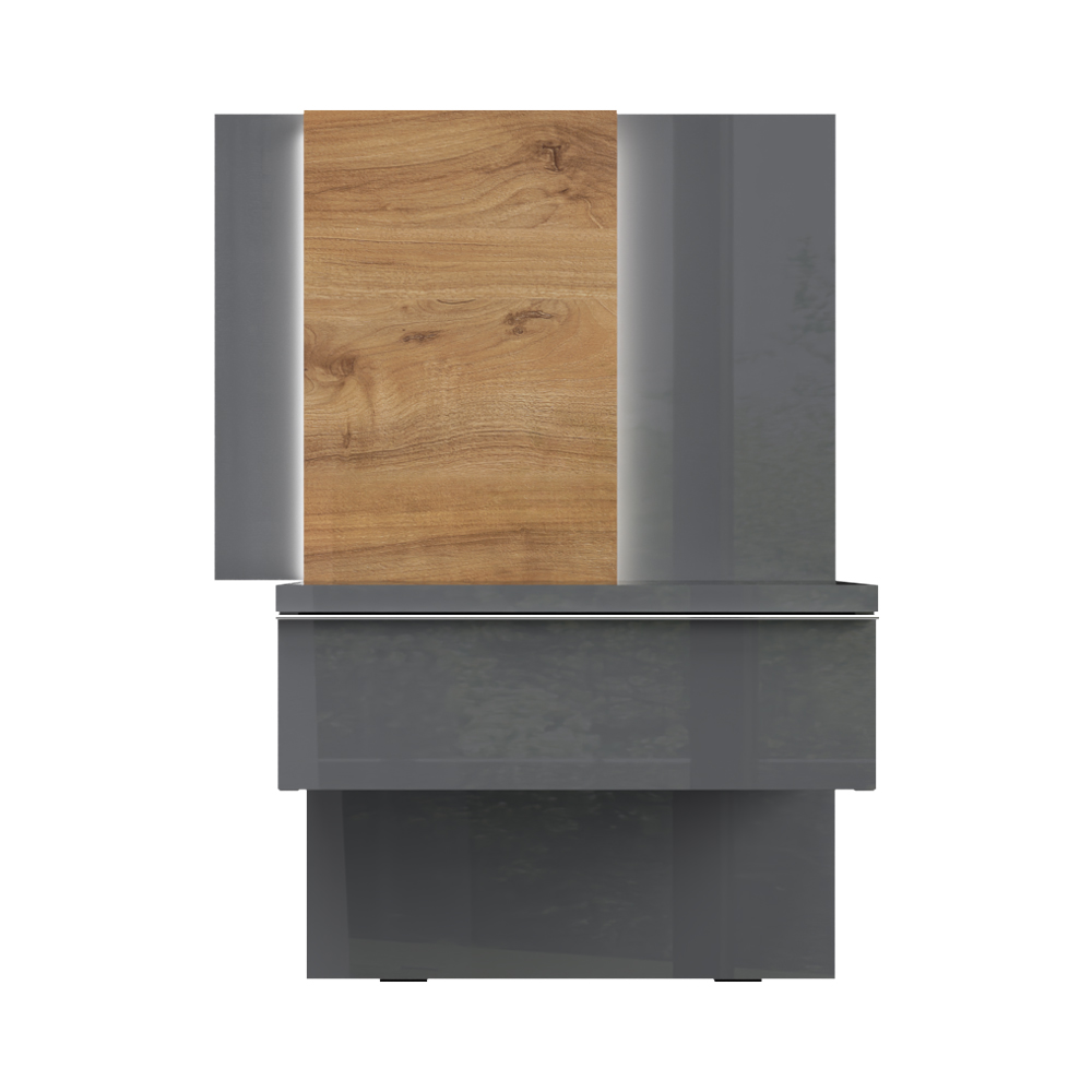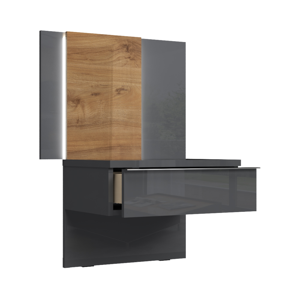 Noćni stočić sa jednom fiokom i zidnim panelom sa rasvetom, modernog dizajna i minimalističke forme.