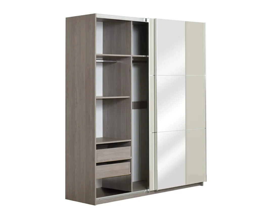 ELEGANCE LINE Američki plakar AP 180 pravo je rešenje za postizanje enterijerske praktičnosti i maksimalne iskorišćenosti raspoloživog prostora. Unutrašnjost plakara je dvodelna. Jedan deo američkog plakara sadrži samo garderober šipku, a drugi deo je podeljen policama za odlaganje robe, sa 2 fioke na dnu, uz garderober šipku. Izrađen je od univera debljine 18mm i poseduje soft-close mehanizam. U cenu plakara nije uračunata rasveta. Kupuje se opciono.