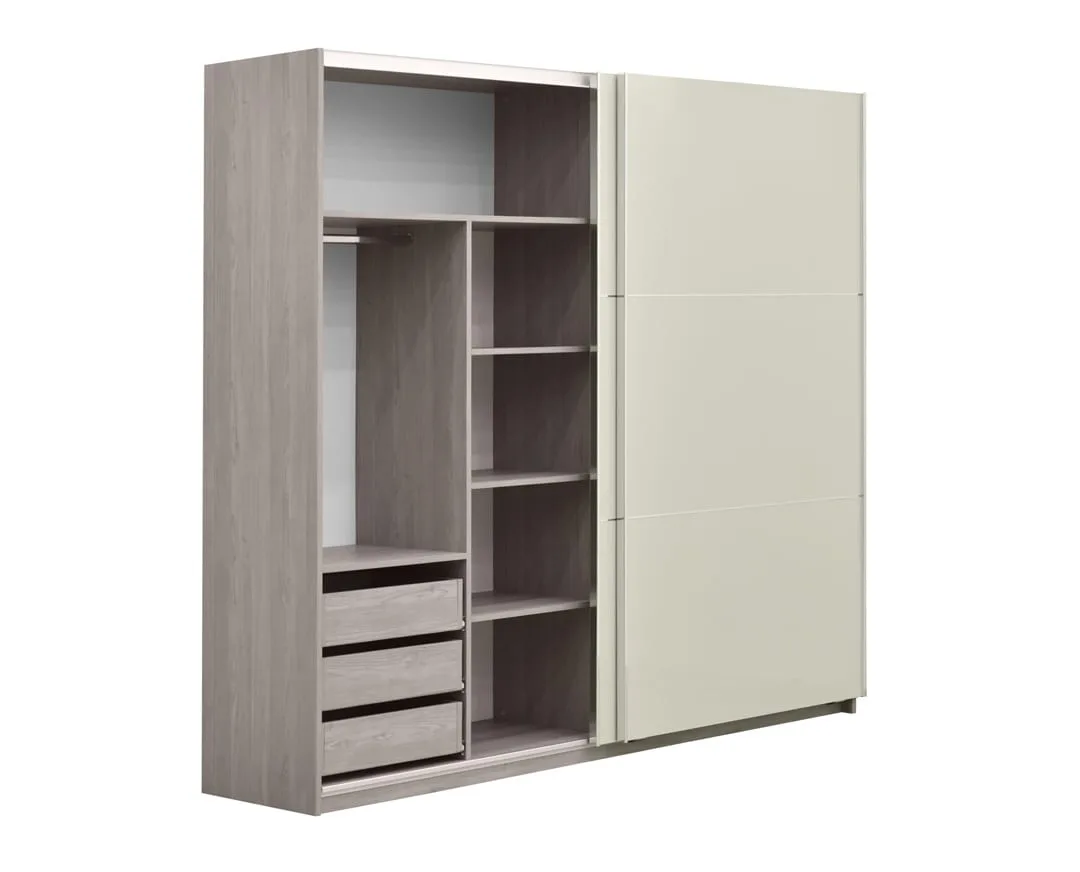 Izuzetno funkcionalni ELEGANCE LINE Američki plakar AP 230 modernog i praktičnog dizajna izrađeni od oplemenjenog univera debljine 18mm. Američki plakari su zbog svoje praktične upotrebe postali pravi hit u svetu, a i kod nas. Vrhunske izrade, sa kliznim vratima, usporivačima, skrivenim fiokama, policama i garderobnim delom, ovaj plakar predstavlja nepogrešiv izbor za vaš dom. Unutrašnjost plakara je trodelna. Jedan deo američkog plakara sadrži samo garderober šipku, drugi deo je podeljen policama za odlaganje robe, a treći deo ima 3 fioke na dnu, uz garderober šipku.