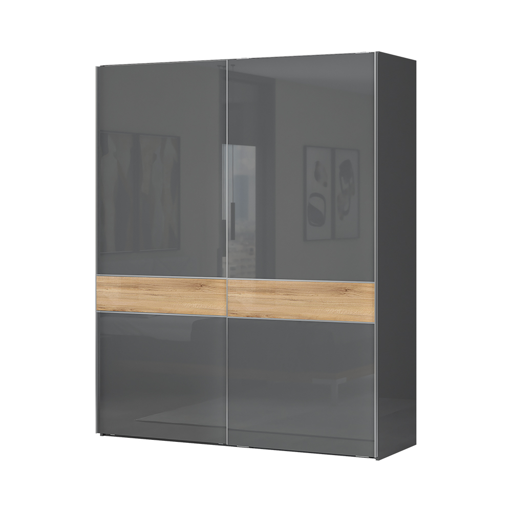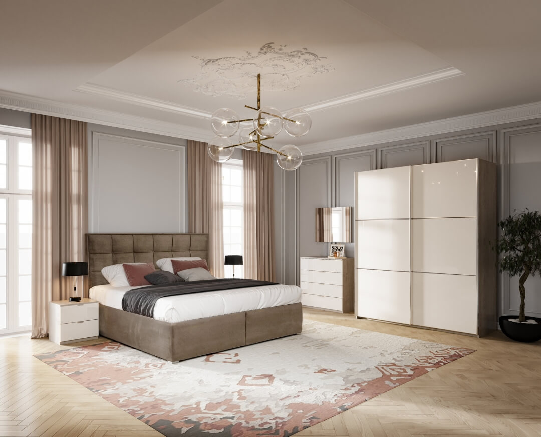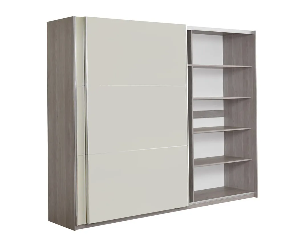 ELEGANCE LINE Američki plakar AP 270 projektovan je da svojim dizajnom i upotrebnim prostorom donese maksimalnu organizaciju u ambijentu spavaće sobe. Raskošnih dimenzija i unutrašnjim rasporedom sa policama (desni deo) i sa gaderobnim šipkama (levi i središnji deo), zadovoljiće potrebe za odlaganjem garderobe. Levi deo sadrži i 3 fioke na dnu. Dva dela američkog plakara sadrže garderober šipku, a jedan deo je podeljen policama za odlaganje garderobe. Izrađen je od oplemenjenog univera 18mm.