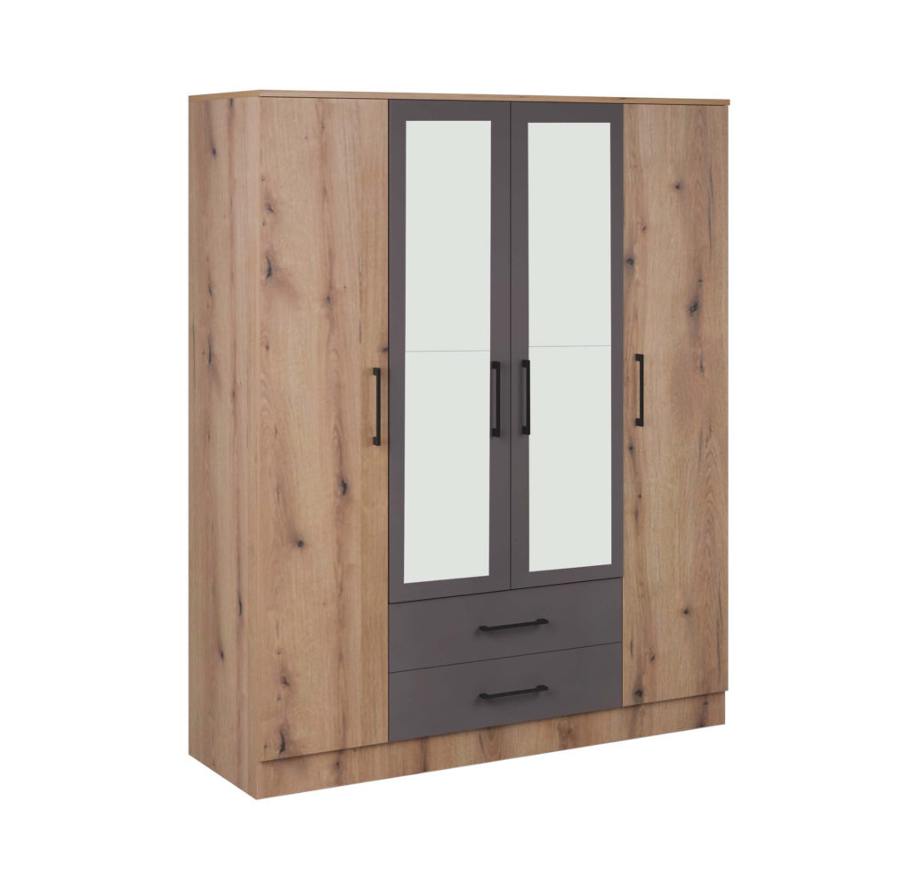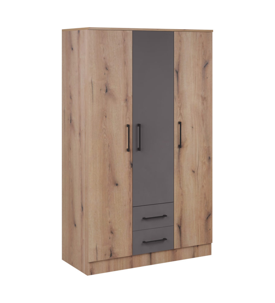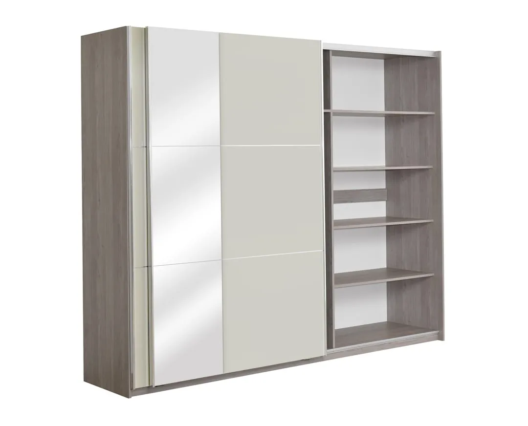 ELEGANCE LINE Američki plakar AP 270 O projektovan je da svojim dizajnom i upotrebnim prostorom donese maksimalnu organizaciju u ambijentu spavaće sobe. Raskošnih dimenzija i unutrašnjim rasporedom sa policama (desni deo) i sa gaderobnim šipkama (levi i središnji deo), zadovoljiće potrebe za odlaganjem garderobe. Levi deo sadrži i 3 fioke na dnu. Dva dela američkog plakara sadrže garderober šipku, a jedan deo je podeljen policama za odlaganje garderobe. Sadrži i ogledalo. Izrađen je od oplemenjenog univera 18mm.
