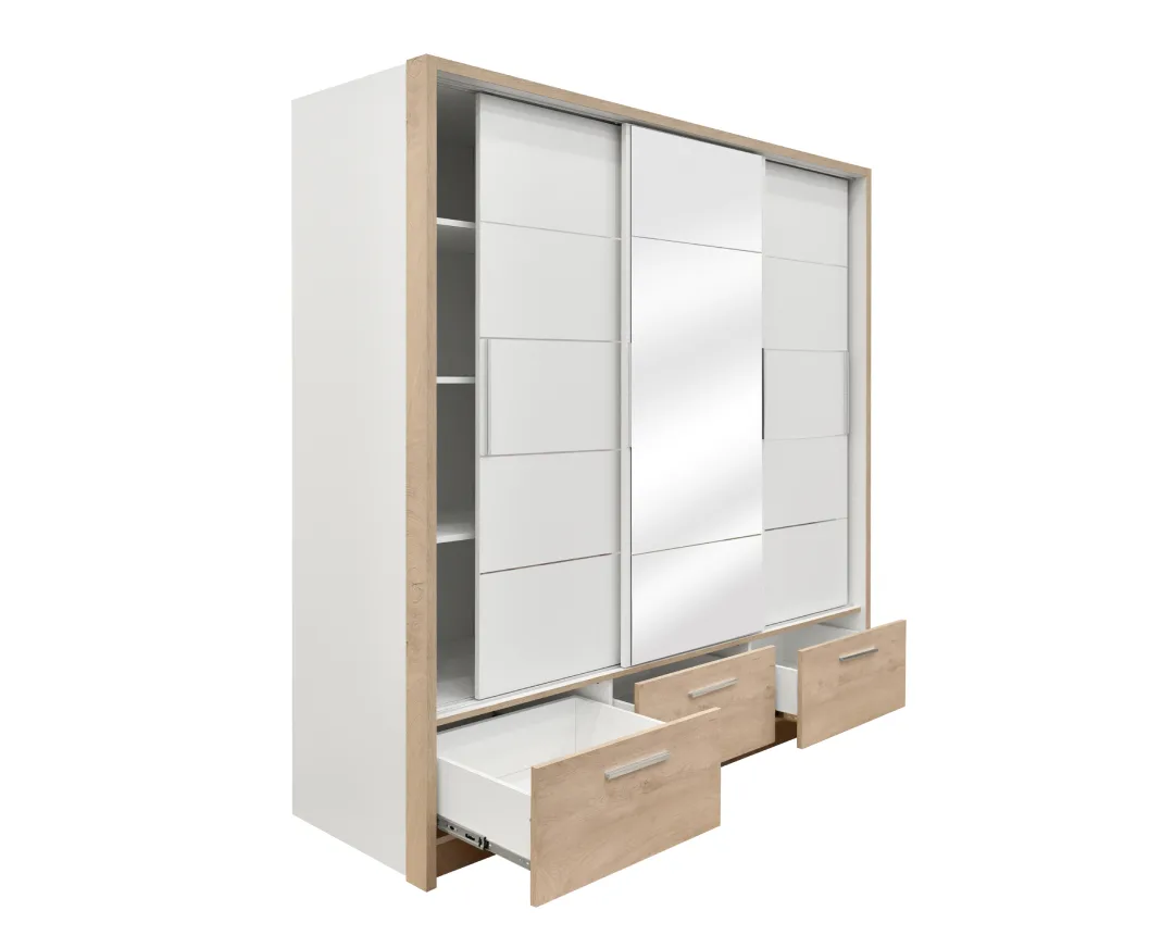 Pored toga, plakar sadrži tri prostrane fioke koje pružaju dodatan prostor za odlaganje jorgana, jastuka ili posteljine, kao i veliko ogledalo koje doprinosi njegovoj funkcionalnosti.