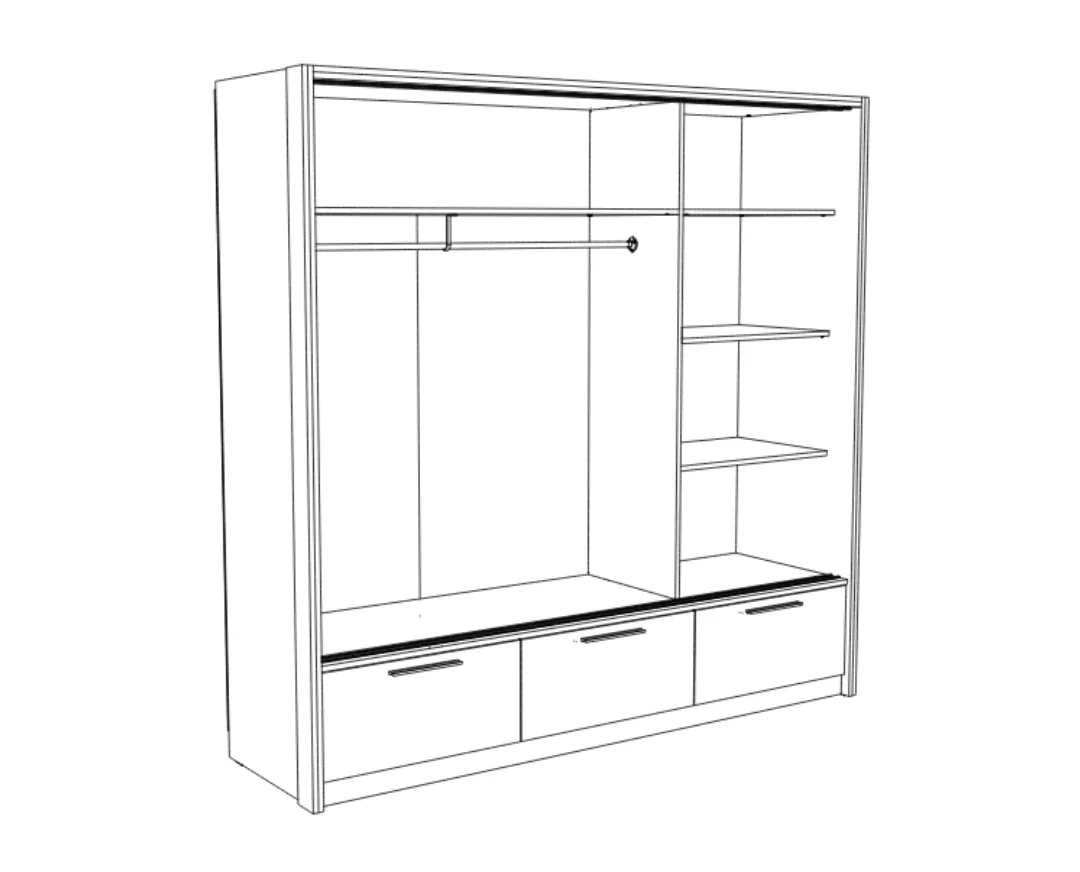 Unutrašnjost ormara podeljena je na dva dela, jedan deo sadrži garderobnu šipku, dok je drugi deo podeljen policama.