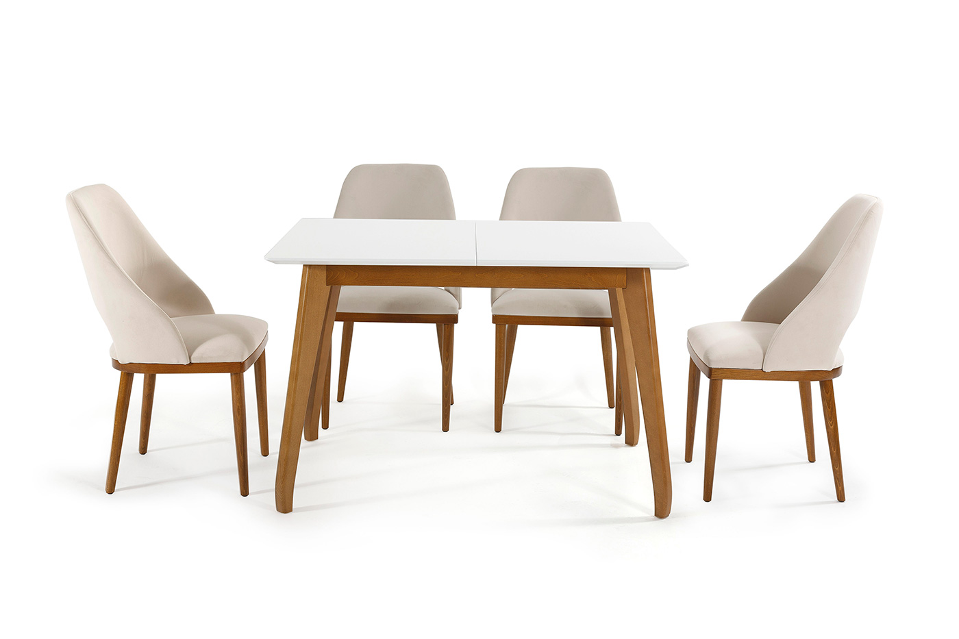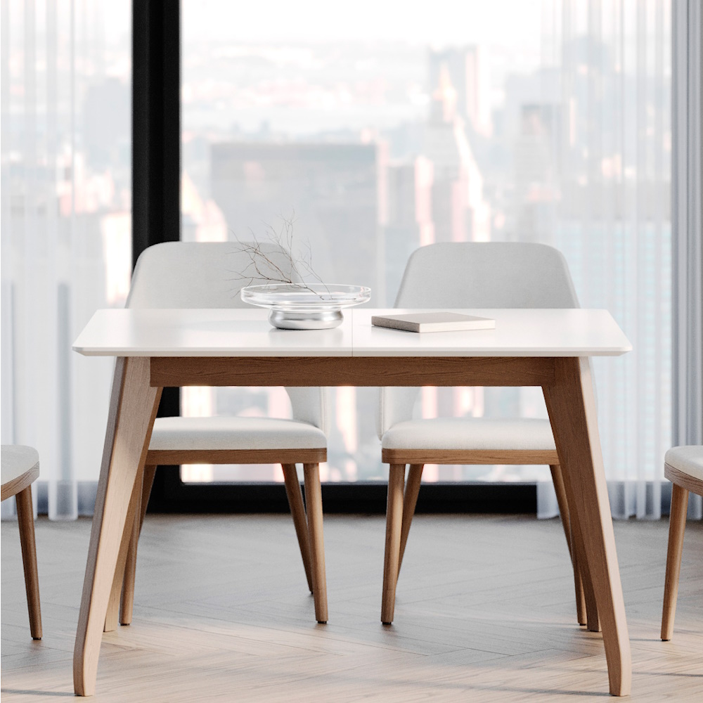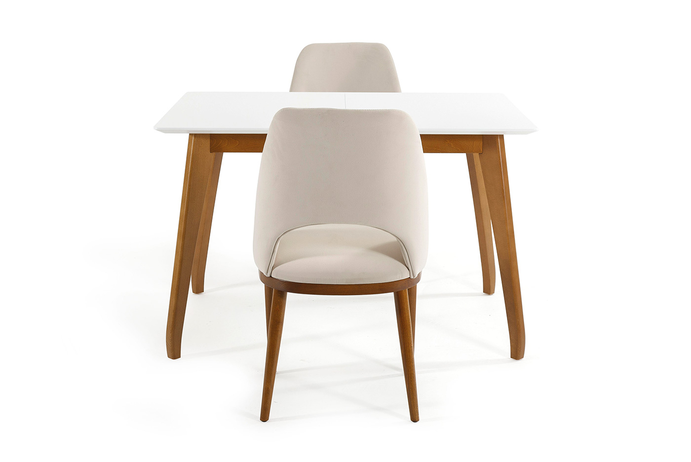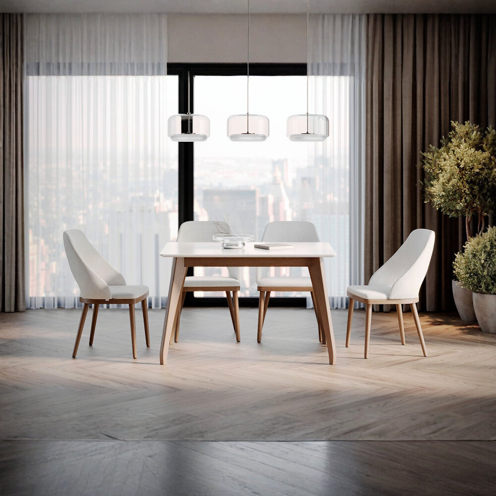 Trpezarijski sto sa drvenim nogarama i pločom od furniranog medijapana.